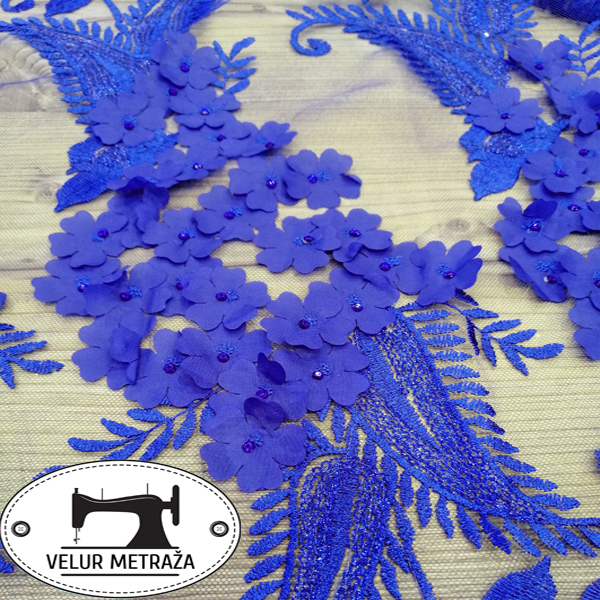 3D čipka u kraljevsko plavoj boji, sa svetnim dezenom u kombinaciji sa tilom. Prelepog i bogatog dezena, savršena je kao materijal za šivenje haljina, bluzica, kao detalj na košuljama.